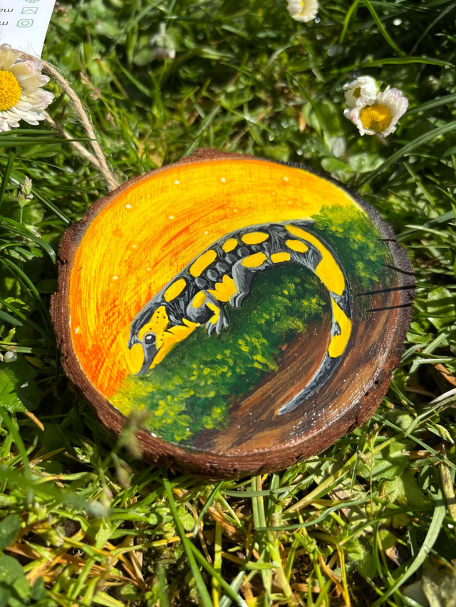 🌿 Peinture artisanale sur rondin de bois – Salamandre tachetée 🎨