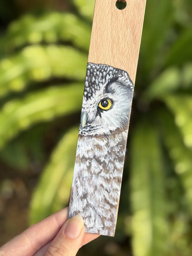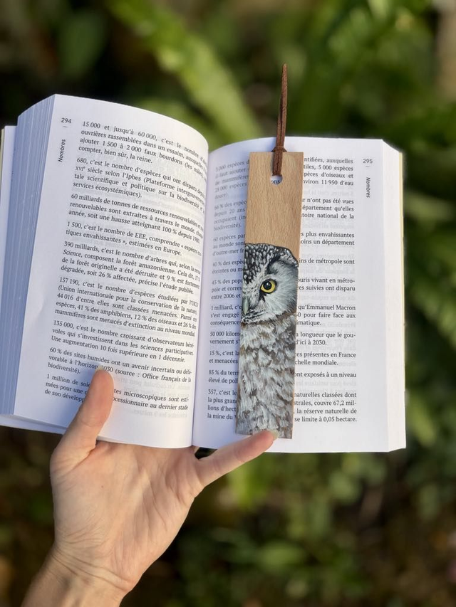 🌿 Marque-page en bois de hêtre – Chouette de Tengmalm 🎨